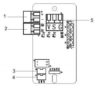 1.声光报警器接口 2.继电器接口 3.显示板接口 4.传感器模块接口 5.24V 电源和 4-20mA 电流环通 讯接线端子或者 485 接口 |